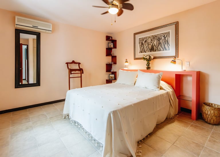 This second story bungalow can sleep up to 4 people. It has a private bedroom with a queen size bed (sleeps 2). With a comfortable fold-down sofa bed (1) in the living room, an additional twin can be added to the spacious area (1).